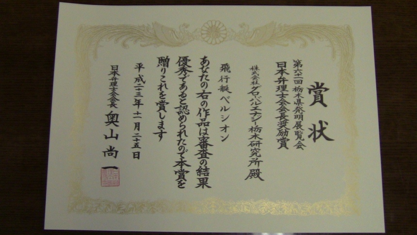 | 本日、栃木県産業技術センターにて第61回栃木県発明展覧会表彰式が行われました。 今回、『飛行艇ベルシオン』が“日本弁理士会会長奨励賞”を受け、賞状並びに楯を頂くことができました。 | ||