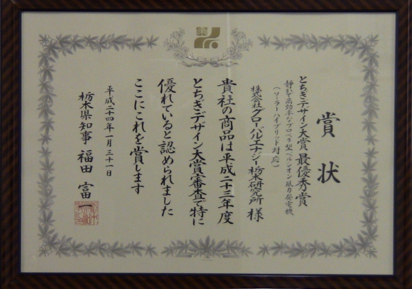 | 本日、栃木県庁昭和館にて平成23年度栃木デザイン大賞の表彰式が行われました。今回、『プロペラ型ベルシオン風力発電機』が“とちぎデザイン大賞の最優秀賞”を受け、賞状並びに楯を頂くことができました。 | ||