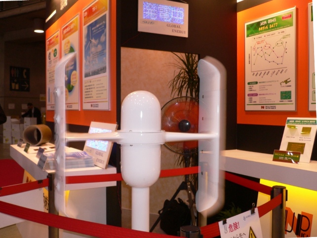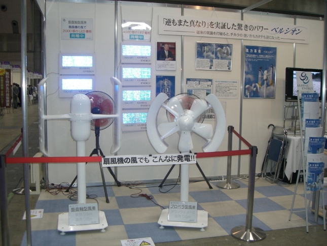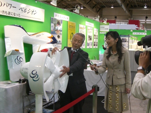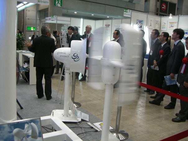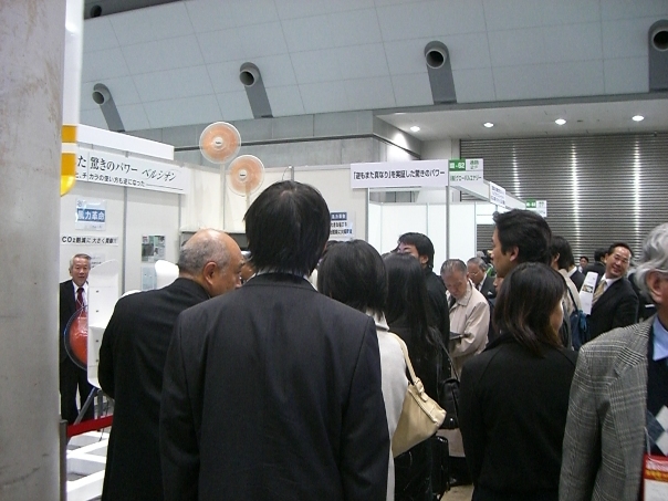 | 11月25日、26日の二日間、東京ビックサイトにて『産業交流展2008』が開催されました。700社を超える中小企業が参加し、4つの分野に分かれて革新的な製品・技術を展示しておりました。今回、環境ブースの一角に直径2.0m、翼長2.7mの垂直軸型風車を扇風機2台で展示したところ反響が大きく、大変多くの方が来場し、多くの質問、意見を頂きました。本当にありがとうございました。 | ||
