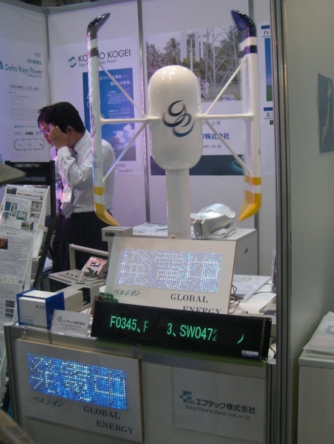 | 本日7月30日〜8月1日の3日間、東京ビックサイトにて第3回新エネルギー世界展示会が開催されています。エフテック鰍ニ葛゚藤工芸が共同出展されているブースに垂直軸型ベルシオン式風車を展示させて頂いています。扇風機1台で勢いよく回転し、LED2000個を明るく点灯できます。 | ||